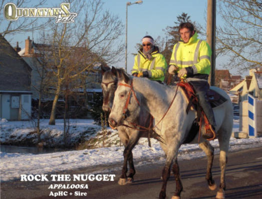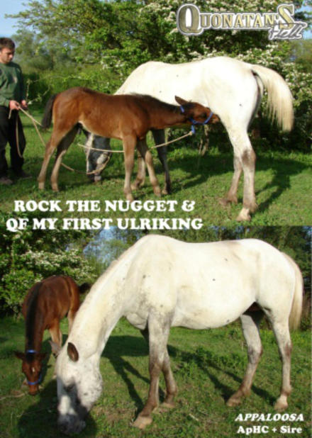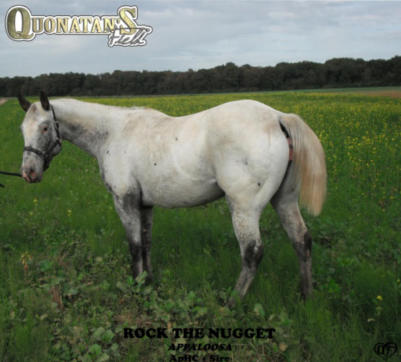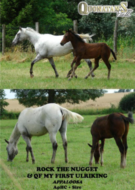 Jument Appaloosa pleins papiers ApHC + Sire, née le 09.04.06 Robe Few Spot Grey Rouen by RW'S ROCKET MAN x NOODLE NUGGET Lignées prestigieuses Rock Star côté père et Nugget Jim côté mère. Bonnes prédispositions pour les disciplines telles que le Halter mais aussi pour le Trail ou le Western Pleasure. Pour nous, ses aptitudes font d’elle une excellente jument d’extérieure agréable sous la selle, sort seule sans problème, débourrée par un entraineur professionnel. Caractère facile, elle est douce et câline… Très bonne mère avec ses deux premiers poulains QF My First Ulriking & QF NuggetStar Ulriking. Vendue en Franche-Comté (70) - Merci à Stéphanie CANAL pour sa confiance !