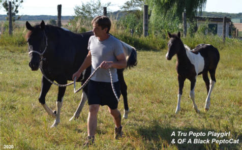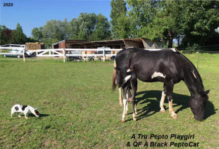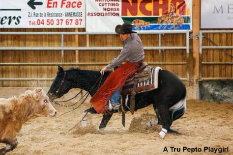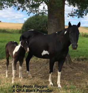Lignée unique 100% bétail : Peptoboonsmal x A Tru Rolex !!!x PLAYBOY BOONSMALétalon Quarter Horse Blue Roan. $157,500 in NCHA.Texas Cutting Open Derby Champion, NCHA Open Finals Top 10, NCHA Finals $10,000 Novice 5th,Bluebonnet Stakes 4-Year-Old Open Derby Finalist 4th,Houston NCHA Open Cutting Champion, NCHA Top 10 $10,000 Novice 3rd, NCHA Top Ten Open 4th, Brazos Bash Open Classic Finalist,Houston NCHA Open Co-Reserve Champion, Acadian CHA Crawfish Classic 4-Year-Old Open Champion, July 4th Circuit Open Derby Reserve champion,Augusta 4-Year-Old Limited Open Futurity Reserve Champion.Fils de Peptoboonsmal$165,300 in NCHA (par Peppy San Badger $172,700 in NCHA x Royal Blue Boon $224,700 in NCHA)et Playboys Stormy $42,200 in NCHA (par Freckles Playboy $60,000 in NCHA)…www.crescentviewranch.com& TRULY VELVET jument Paint Horse Black Tobiano. Fille de A Tru Rolex, Multi Champion du monde, plus de 2600 points de performance APHA.Prédilection pour les épreuves sur le bétail, il est « Lifetime Point Leader » dans 6 disciplines :Amateur & Open Heading, Heeling et Steer Stopping. Ses produits ont déjà remporté des titres de World Champion.“ Now the ALL TIME Open Point Earning Stallion in APHA History !!! “www.painteddreams.usNous avons importé Pepto des US, elle vient d’un élevage de chevaux situé en Floride dont les lignées sont orientées sur le bétail.Elle est arrivée chez nous le 10 Janvier 2012, son acquisition est une expérience unique et inoubliable… Pepto représente énormément pour nous, elle combine tout ce qui nous tient à cœur : Couleur & Grosses Lignées de Travail sur le Bétail !Elle est homozygote pour le noir.Après seulement 10 mois d’entrainement, elle a participé au French Futury 2014 Cutting Open NCHA avec Etienne Galline au Golden Horses Stables. Le 16 mai 2020, elle a donné naissance à un superbe poulain QF A Black PeptoCatx Once You Go Black (Hydrive Cat & RG Sugar Lena).Vidéo de Pepto au pré début mai 2021(avec QF A Precious CatSan)