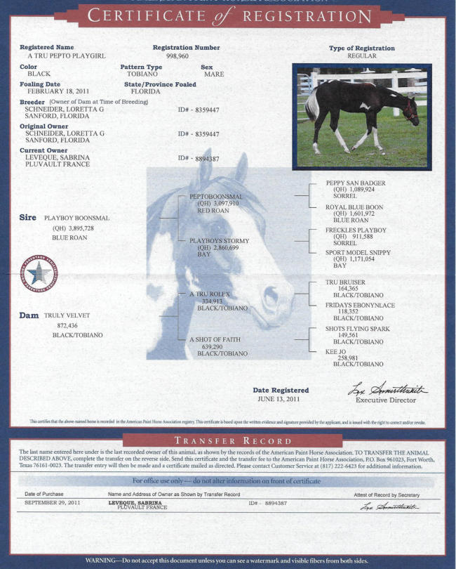 A TRU PEPTO PLAYGIRL2011 Paint Horse Mare APHA + SIRE Homozygous Black TobianoHERDA N/N - GBED N/N - PSSM1 N/N - MH N/N - LWO N/N - BLACK FACTOR E/EA VENDRE / FOR SALE - 11.000€VENDU / SOLDPepto est partie en Allemagne rejoindre le Simen Horses.