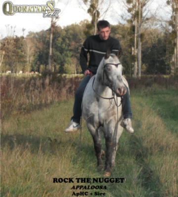 Jument Appaloosa pleins papiers ApHC + Sire, née le 09.04.06 Robe Few Spot Grey Rouen by RW'S ROCKET MAN x NOODLE NUGGET Lignées prestigieuses Rock Star côté père et Nugget Jim côté mère. Bonnes prédispositions pour les disciplines telles que le Halter mais aussi pour le Trail ou le Western Pleasure. Pour nous, ses aptitudes font d’elle une excellente jument d’extérieure agréable sous la selle, sort seule sans problème, débourrée par un entraineur professionnel. Caractère facile, elle est douce et câline… Très bonne mère avec ses deux premiers poulains QF My First Ulriking & QF NuggetStar Ulriking. Vendue en Franche-Comté (70) - Merci à Stéphanie CANAL pour sa confiance !